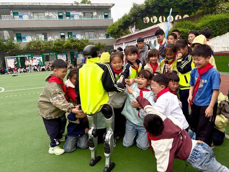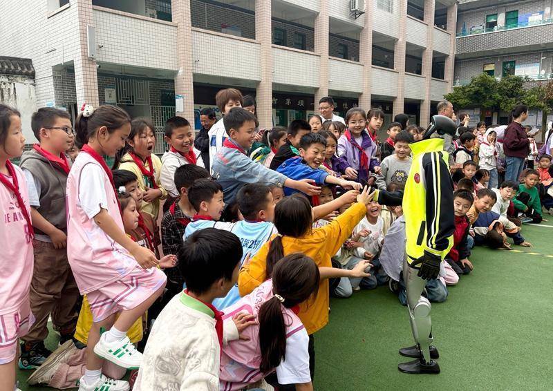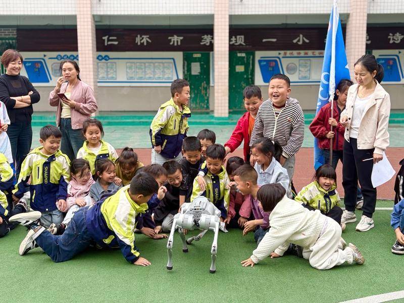 在仁怀市茅坝一小,同学们围拢在展示区域,近距离与机器人握手,体验前沿科技的神奇与乐趣。